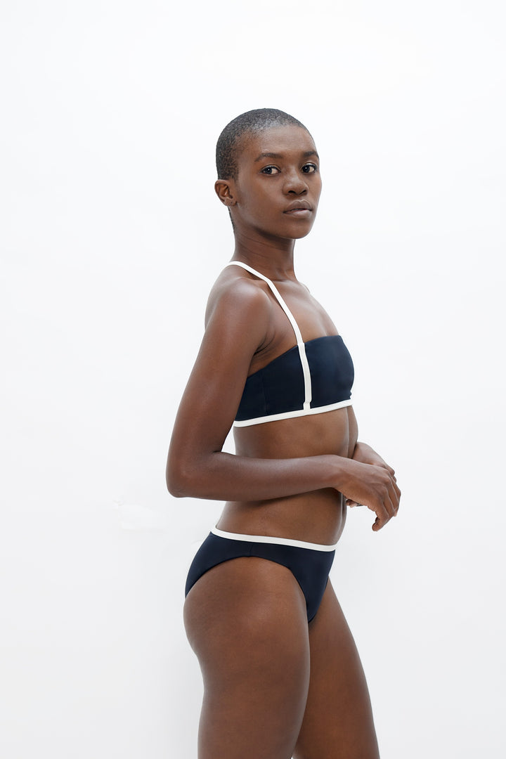Details - Fully lined- Classic style- Bold lines for structure- V design on the back- Embellished with 1 People's signature brass logo on the back- OEKO-TEX® certified fabric- Made from soft and light fabric with UV protection (UPF 50+)- Chlorine resistant- Comes in a handmade pouch made from abandoned fishing nets and knitted by empowered Indonesian women